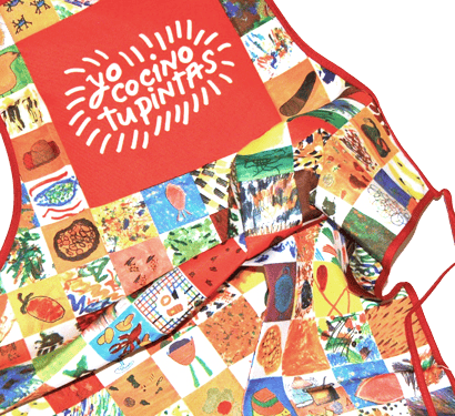 Delantal de tela estampado con algunos dibujos que aparecen en la publicación "Yo cocino, Tú pintas".